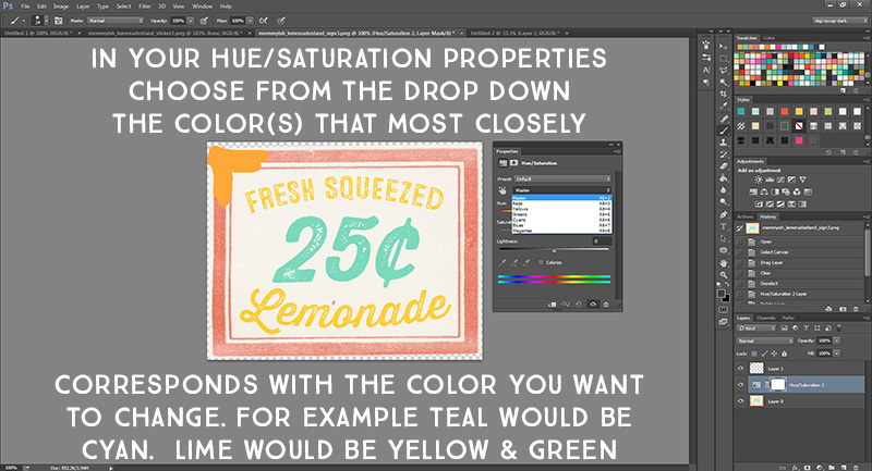 After I have my color sampled I then play around with my adjustment layer. This is where the magic happens! You will need to determine the main colors of your element and then adjust accordingly. Coral uses a red hue so from the drop down I choose red as the color I would like to adjust. If I was going to change the teal color I would choose cyan. If I was going to change the yellow I would choose yellow.