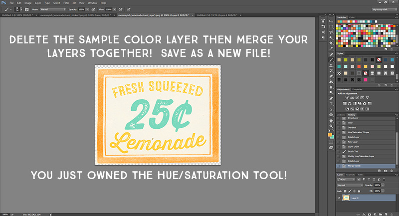When you have accomplished the look you want you can delete the sample color layer and merge the adjustment layer with your element. I save the file as something new and call it done! You can also pull your edited hue/saturation layer into other element documents with the same color you want to change to gain the same color effect on multiple items (as you can see in the first image of the post)