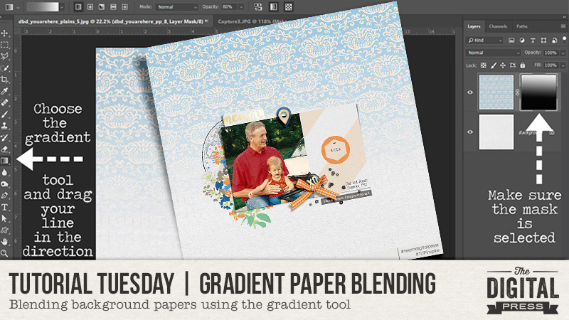There is a more detailed Tutorial Tuesday all about that method of blending here – Blending Papers in Photoshop and one on using gradients to blend photo masks here – Masking with Gradient Tool.
