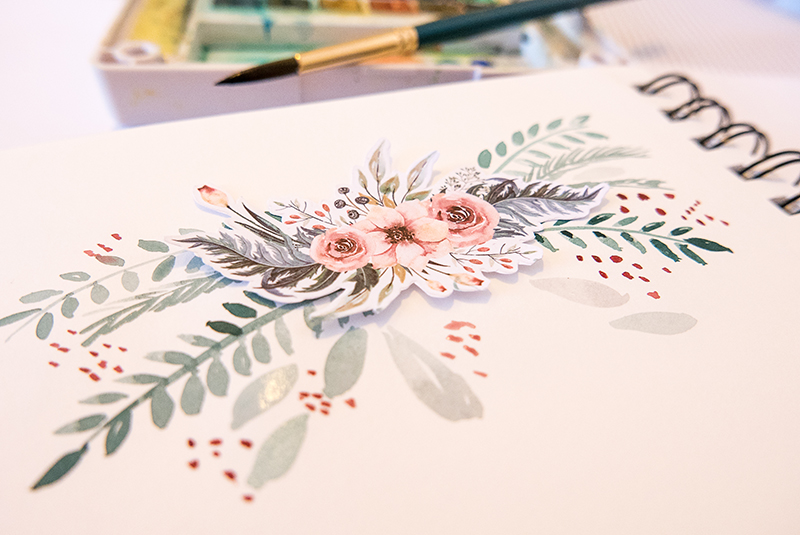 When I first saw the gorgeous watercolor florals in this beautiful collection, I knew I wanted to paint something to match them. Then, I started thinking about painting some leaves below the printed florals. For my project, I actually didn’t make a previous digital version in Photoshop (which, sometimes, I do). This time, I simply chose my favorite elements, cards, and papers and then printed all of them, as shown in the image below…