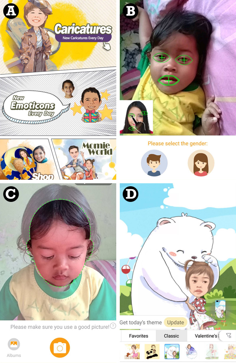 In the image above, going counter clockwise from top left, shows… (A) the app interface, (B) adding a face photo, (C) customizing the face features, and (D) choosing a theme.